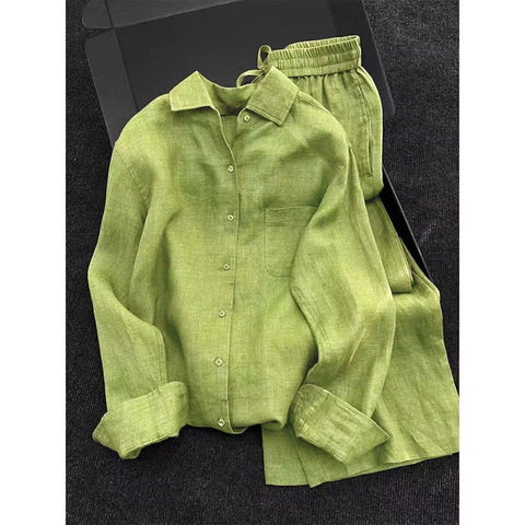 LEA PLC-16 High-End Green Linen Women's Casual Suit Lazy and Relaxed Two-Piece Set with Wide-Leg Pants and Shirt